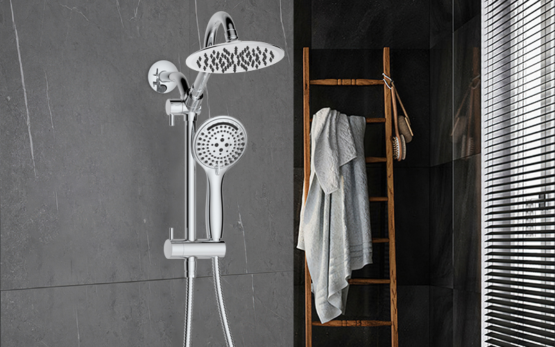 上出水彎管套裝;頂噴內置球頭,可實現多角度旋轉調整;把手切換頂噴出水、花灑出水;轉動把手調節(jié)滑座高低