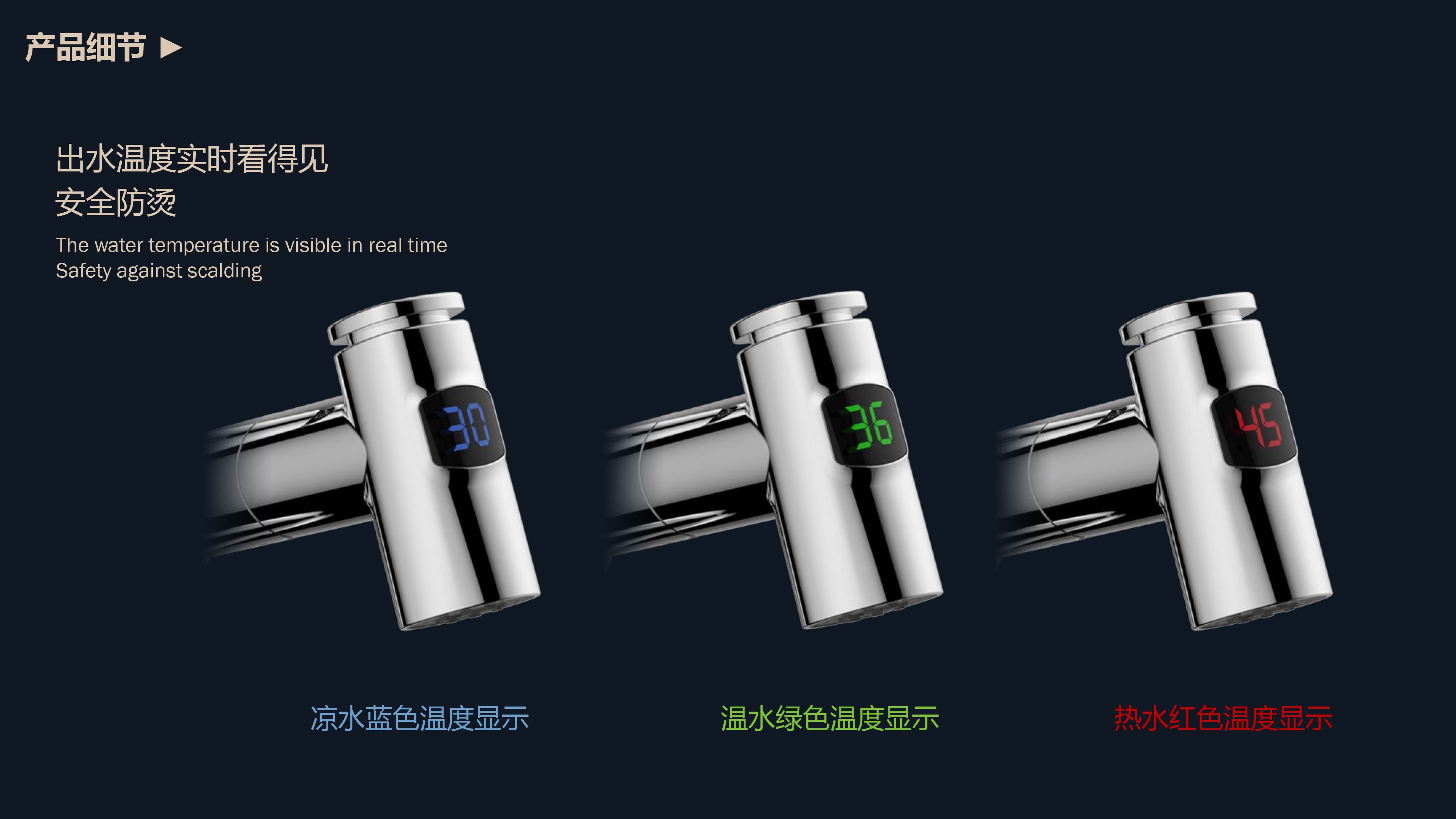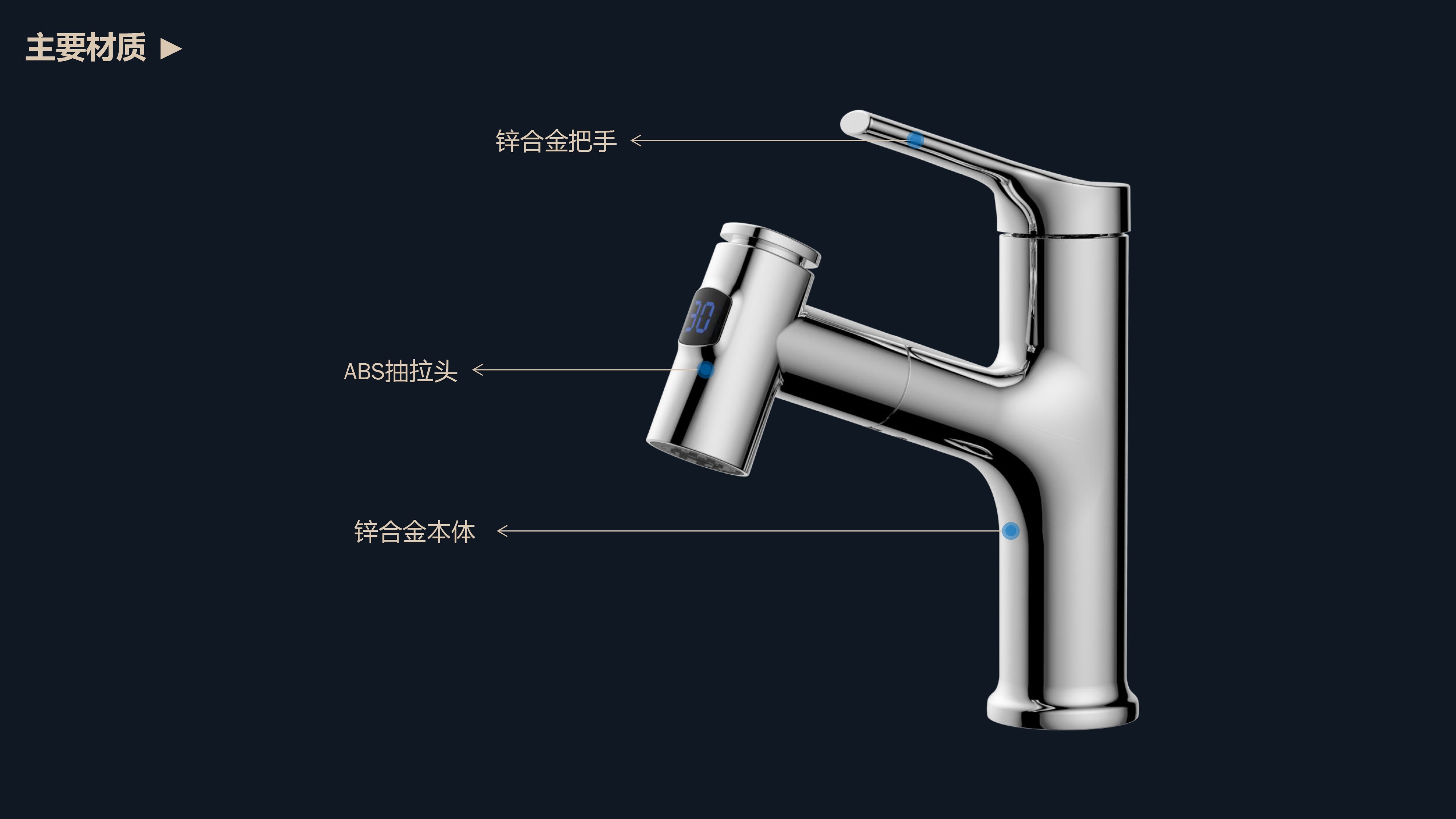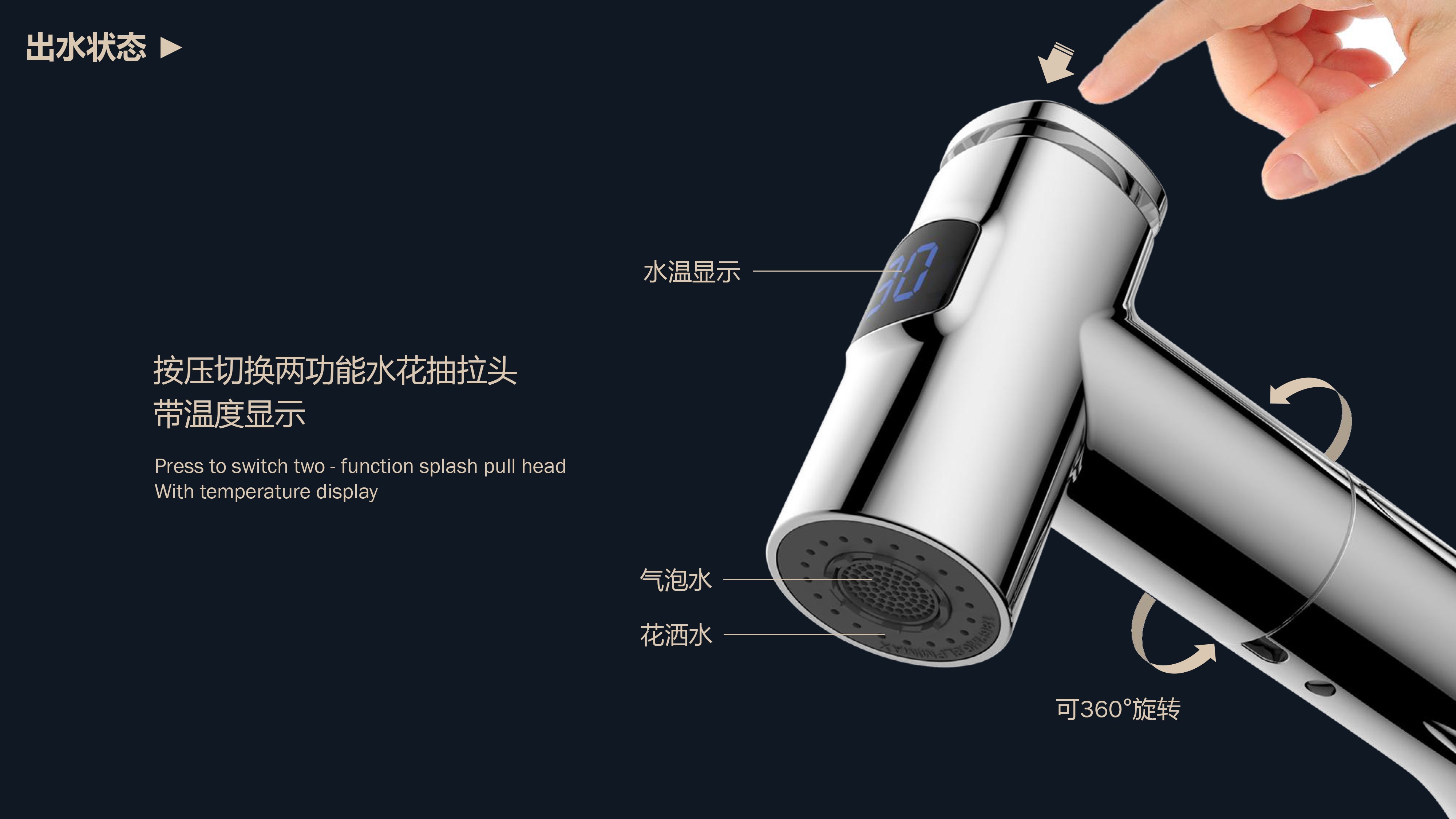 數(shù)顯面盆抽拉龍頭,解鎖龍頭舒適用法;360°全方位清洗;日常洗頭利器,抽拉出水輕松洗;按壓切換兩功能水花抽拉頭;出水溫度實(shí)時(shí)看得見(jiàn),安全防燙