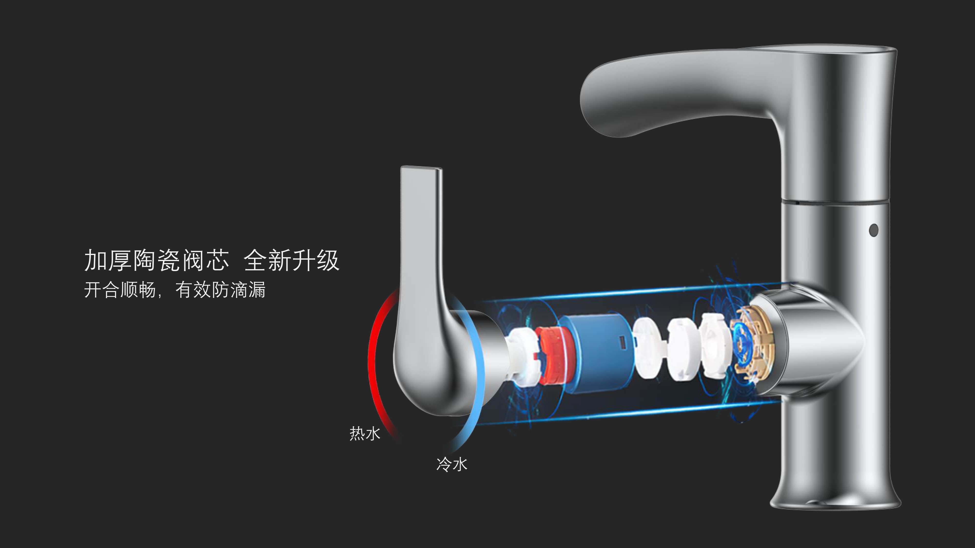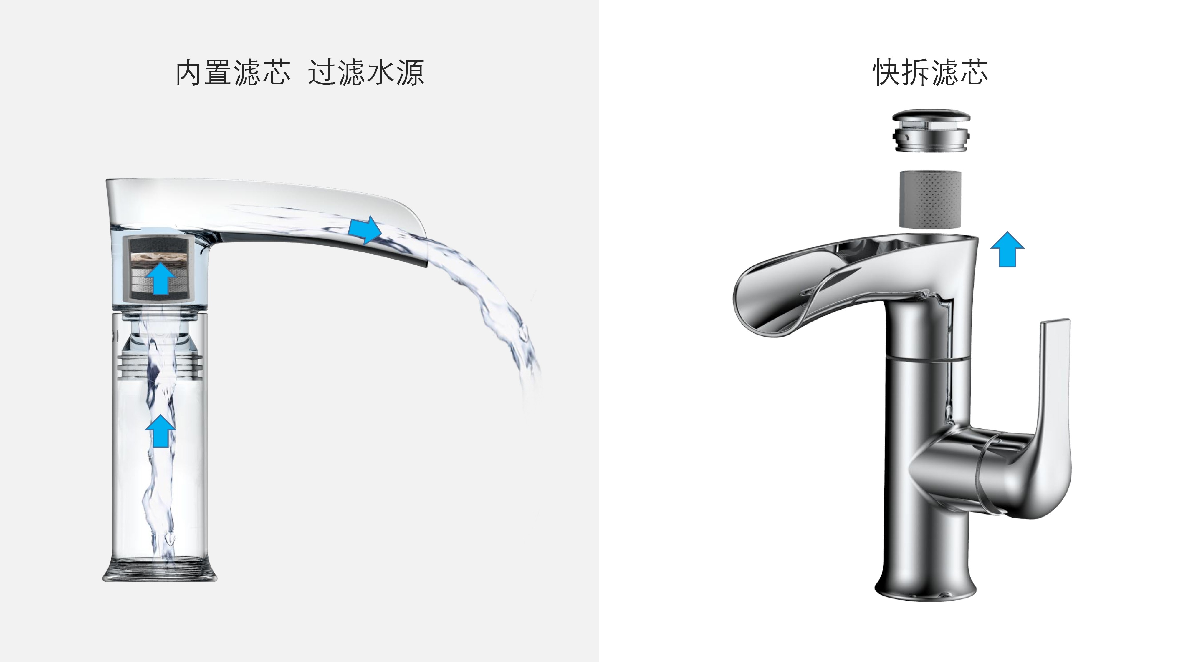 簡約時尚設計;加厚陶瓷閥芯開合順暢,有效防滴漏;內置快拆可更換過濾濾芯;